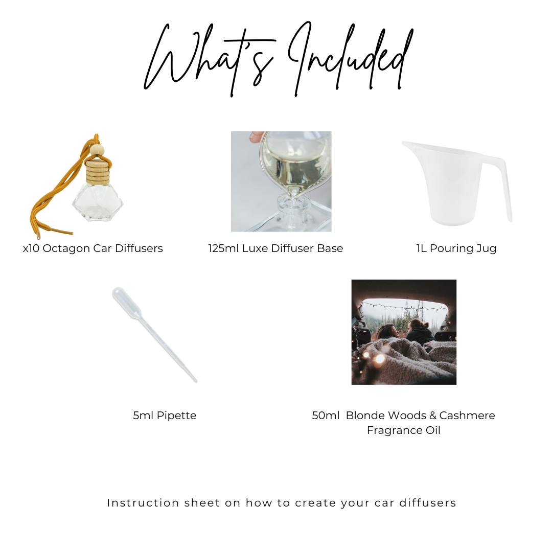Experience the ultimate luxury with our Car Diffuser Pack featuring PCS custom fragrance oil in Blonde Woods & Cashmere, elegant octagon car diffusers, and Luxe Reed Diffuser Base for maximum permeation.